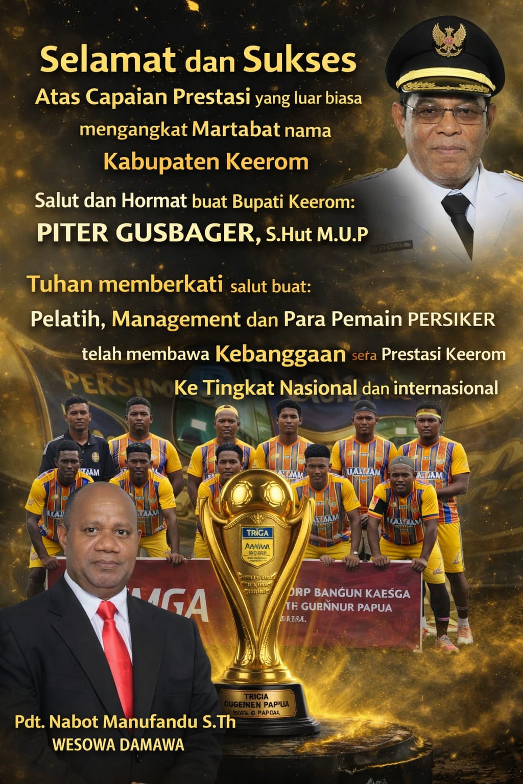 Nabot Manufandu juga menyampaikan selamat dan sukses kepada sang arsitek skuad Persiker Keerom Elia Aiboi bersama Bupati Keerom Piter Gusbager dan Manager Persiker yang berhasil membawa tim kebanggaan masyarakat Keerom ini ke kanca nasional dan Internasional.